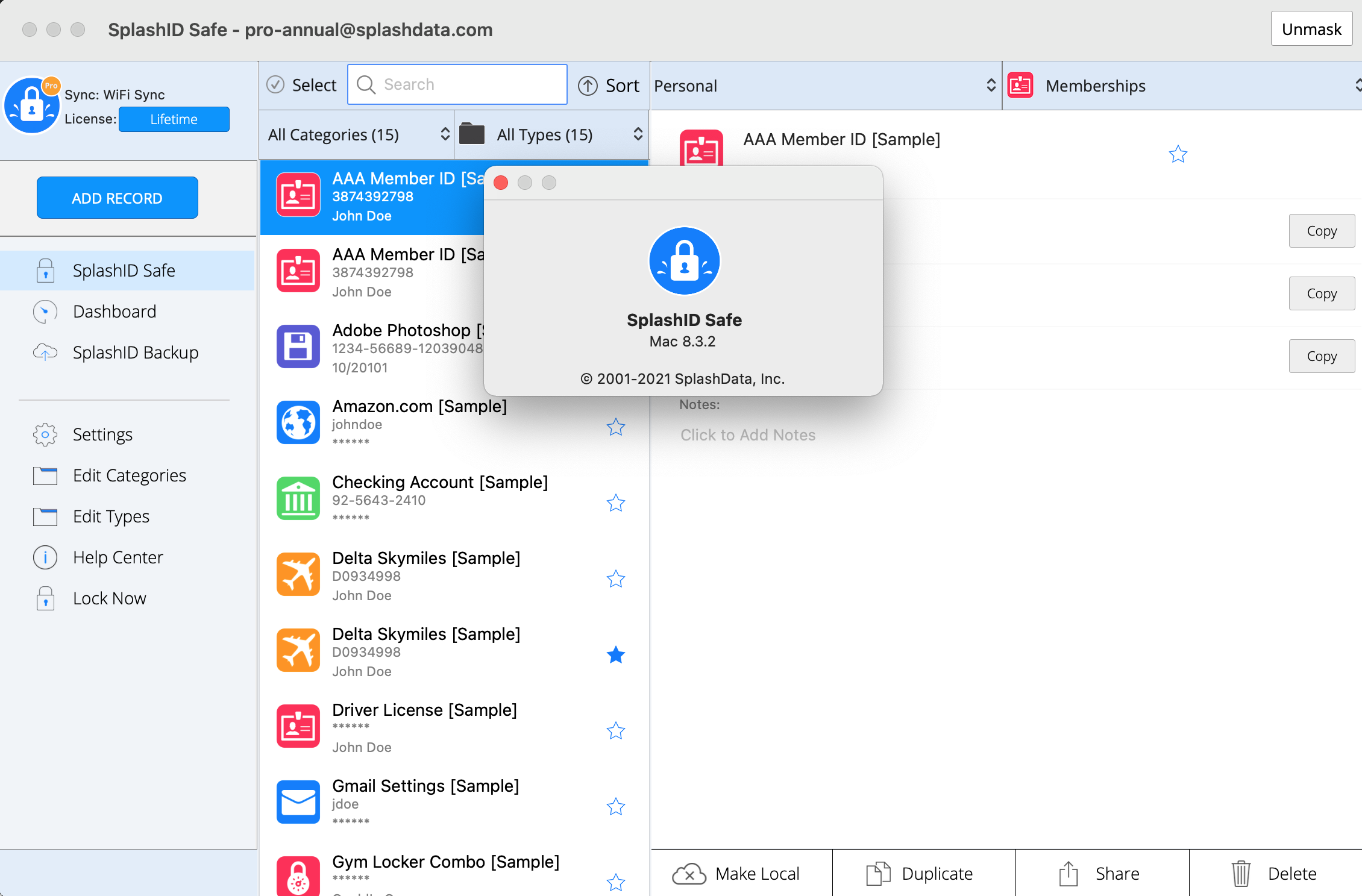 SplashID provides quick and easy access to all of your personal identification information, including usernames, passwords, credit cards, PINs, calling card numbers, frequent flyer numbers, insurance info, and more. Data is stored in a secure, encrypted, password protected format and can be synchronized between SplashID on your mobile device and SplashID on the desktop (Windows, macOS, and web). You may prefer to do most of your data entry on the desktop, however, since it's faster and easier with a keyboard, and then synchronize that data to your other SplashID apps.