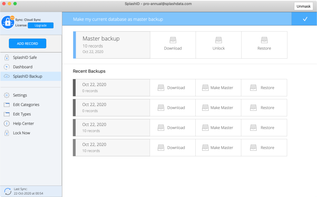 With SplashID 8, cloud sync users have a new backup service that protects them from data loss forever. Every week, a new encrypted backup is automatically created for you. Your 5 most recent backups are available anytime to download or restore as your current database. And you can lock in any backup (or your current database) as your master backup.