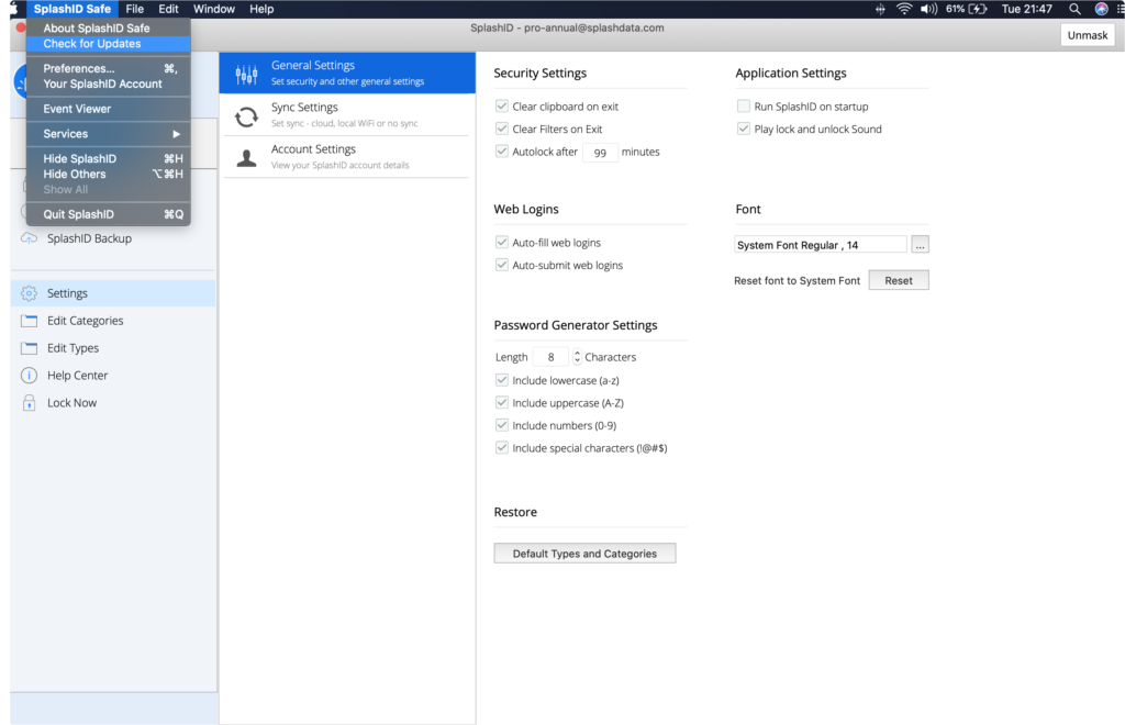 The Check for Updates feature in the application menu allows you to check for new versions of SplashID when they get released.