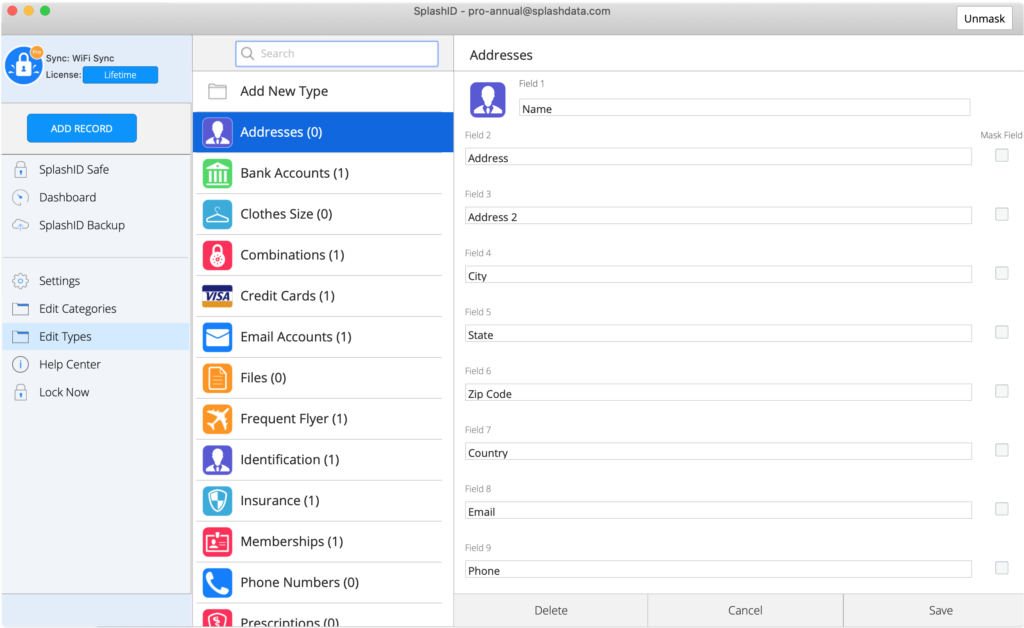 Types act as templates, which define the structure for the items you want to store in SplashID. You may define up to nine Custom field labels and a default icon for each type, as well as specify the fields you wish to mask.