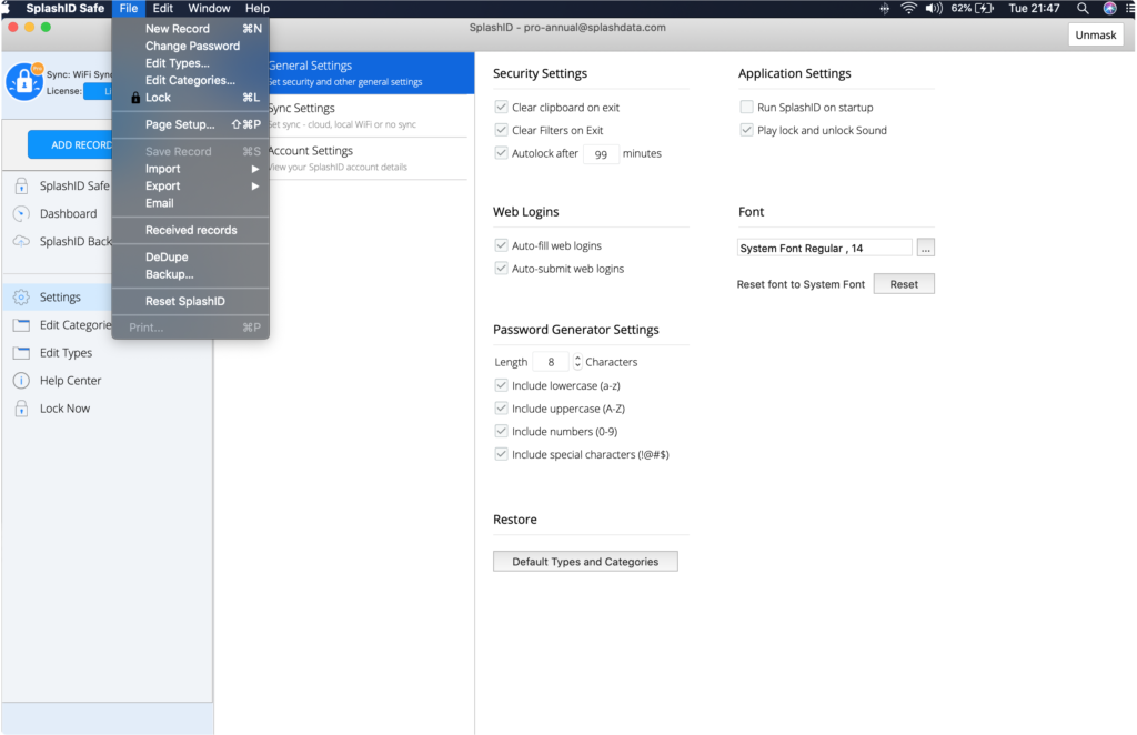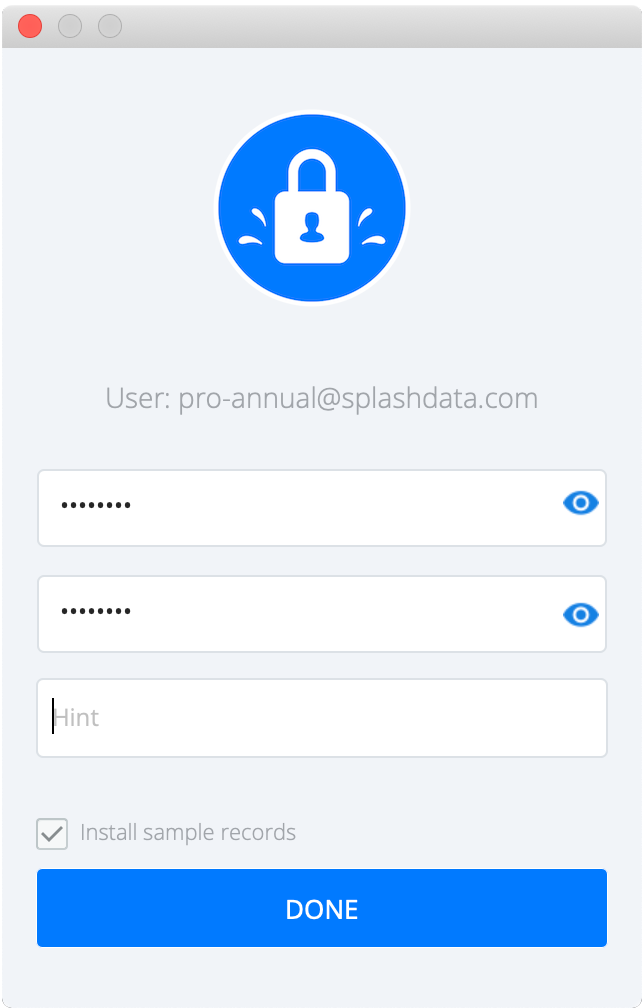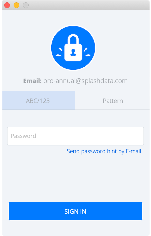 You have the option to choose how you want to login to SplashID on your Mac desktop. Use your strong master password to sign in to the application for the first time after installing the app. Once set up, the master password is used to access your account and unlock the application.