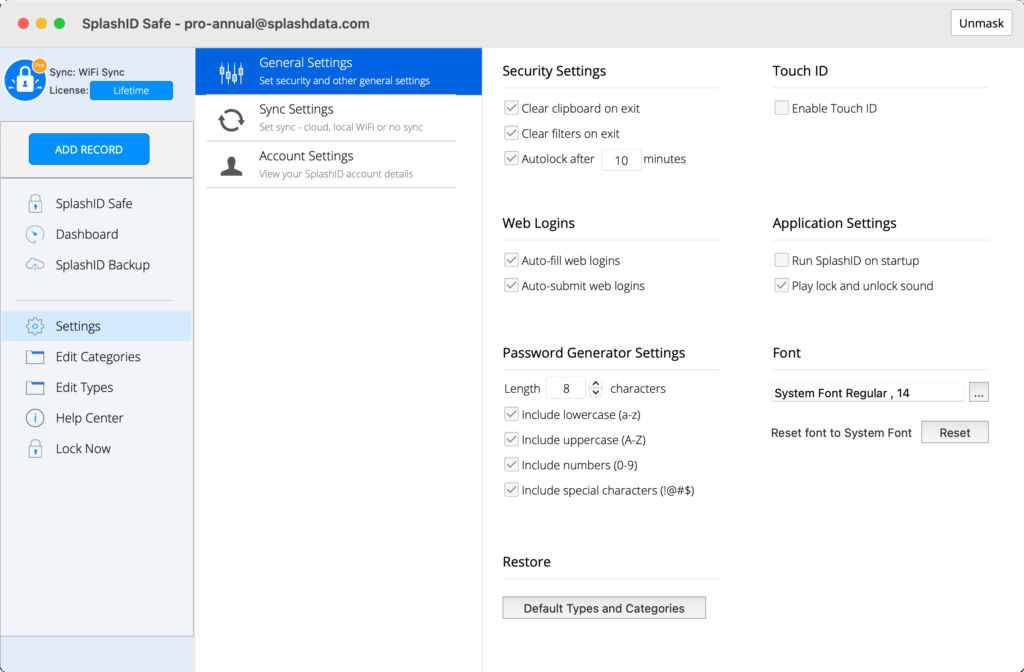 Settings allow you to customize SplashID to fit your needs and to maintain your SplashID account. The sections below give a brief description of the available settings.