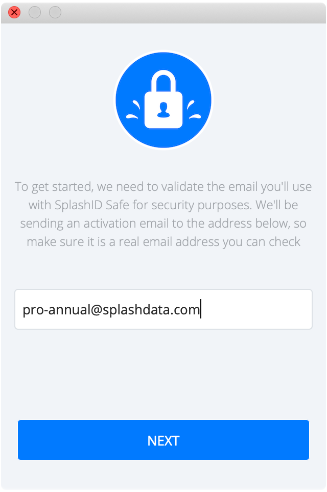 Launch SplashID on your desktop and enter your email address to start creating your account. It is recommended that you use all lower case letters in your email address to prevent any confusion with your account email address. The screenshots below will show you the steps required to complete the registration process.