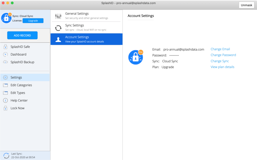 - Change Email - Select to edit the email address you associate with your SplashID account.