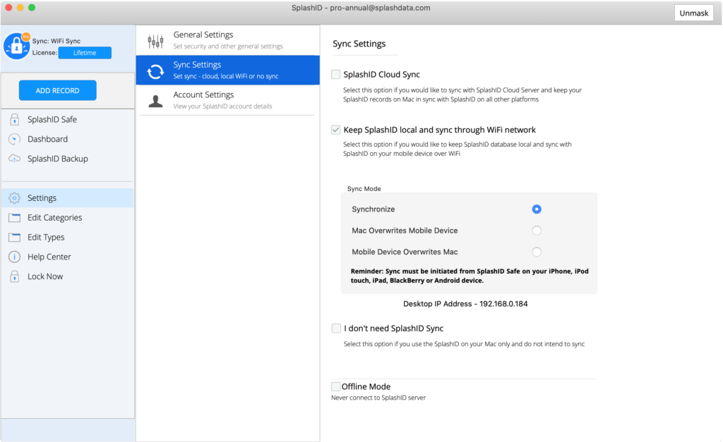 This is the familiar WiFi sync solution that has been in SplashID since version 4. You can manually connect and sync SplashID on the mobile device with the PC or macOS desktop SplashID over your local WiFi network.
