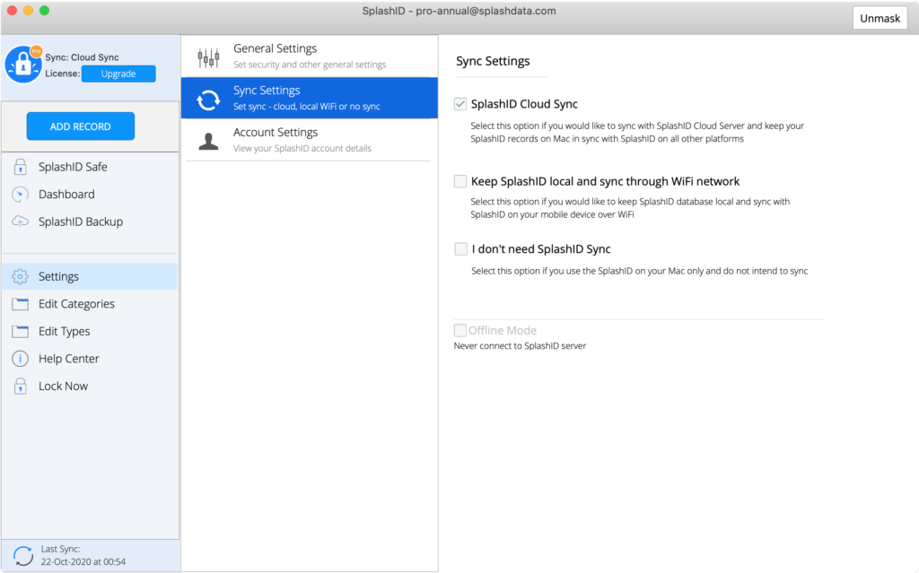 This is where you select your sync settings for SplashID Desktop. Since SplashID 8, a SplashID Pro license is required for either of the three sync methods, Cloud or WiFi or No sync. You can choose and change the sync method for your account at any time if you have a SplashID Pro license.