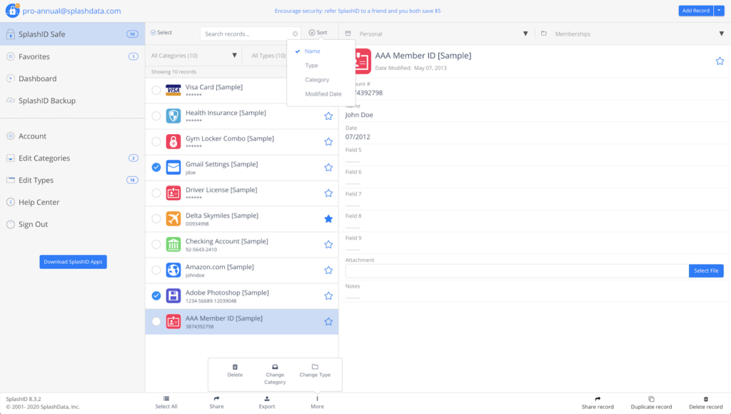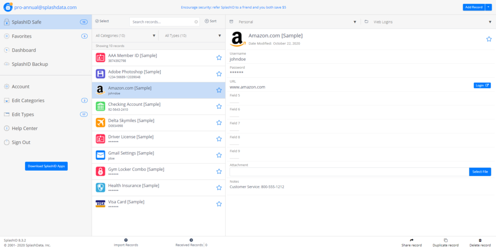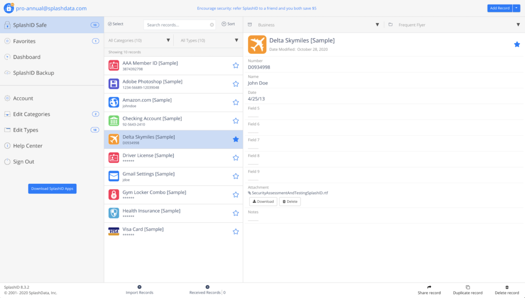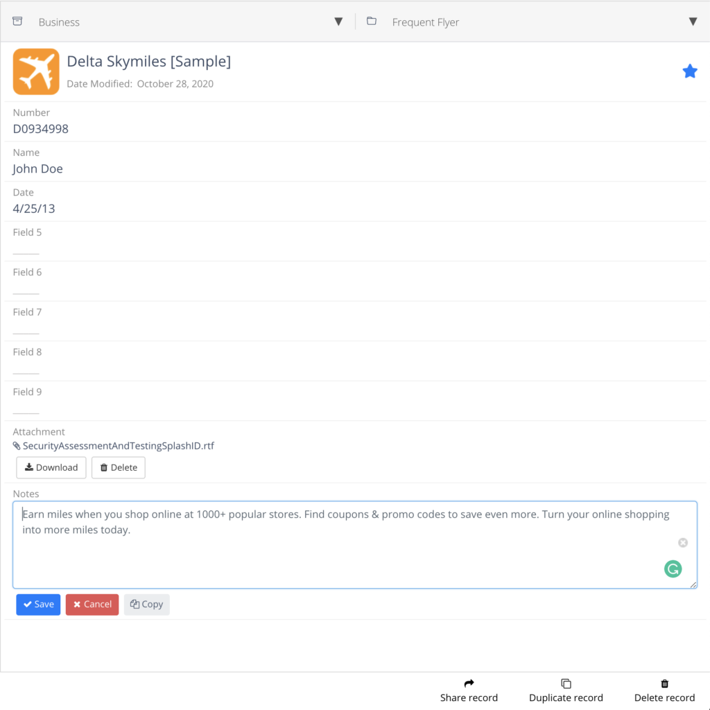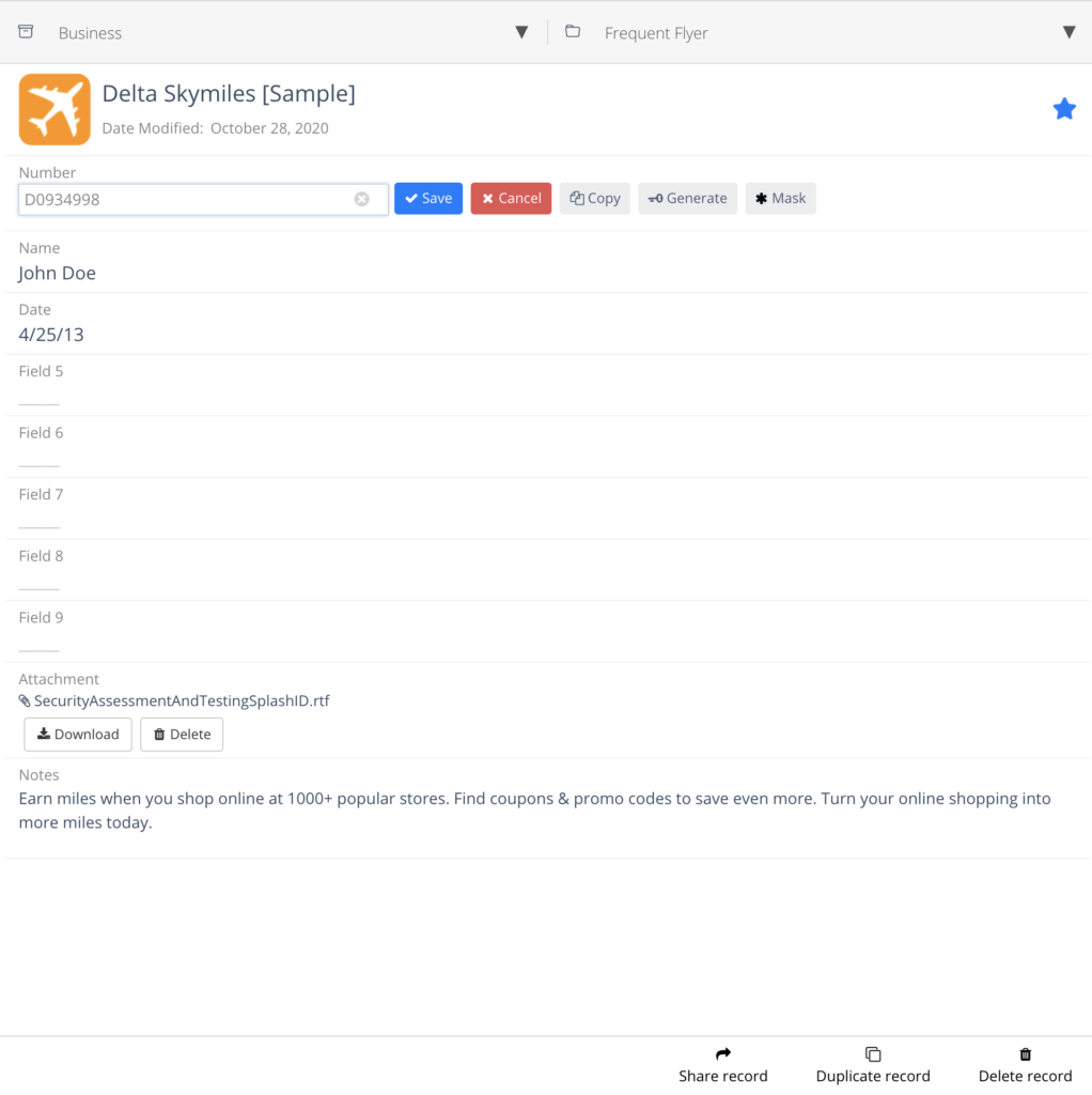 - SplashID Safe - This is the list of Records, where you can search, view, and edit your secure records.