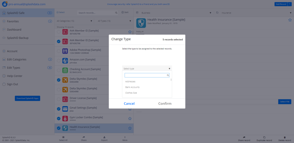 - Reset SplashID types and categories - Use this option to recover the original types and categories that had initially come with the account. Any changes made to the SplashID types will get reset to the original types.