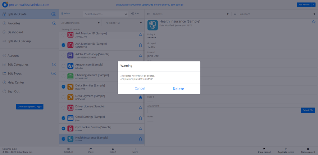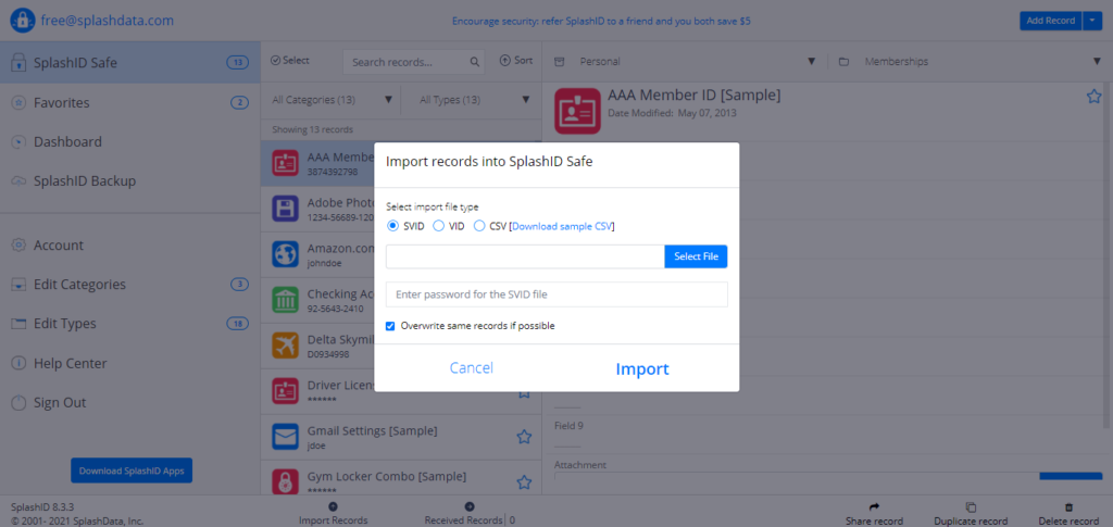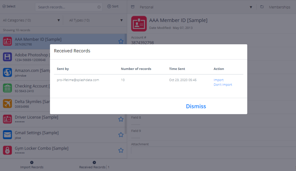 If another SplashID user has shared records with you, then you can see the shared records here. It will give you the option to import the shared records into your account or remove them from the received list.