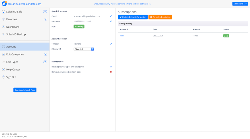 Subscriptions details view - Shows billing history of invoices you have paid on your SplashID Pro account. Provided by our billing service, Recurly.