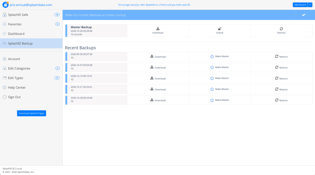 With SplashID 8, cloud sync users have a new backup service that protects them from data loss forever. Every week, a new encrypted backup is automatically created for you. Your 5 most recent backups are available anytime to download or restore as your current database. And you can lock in any backup (or your current database) as your master backup.