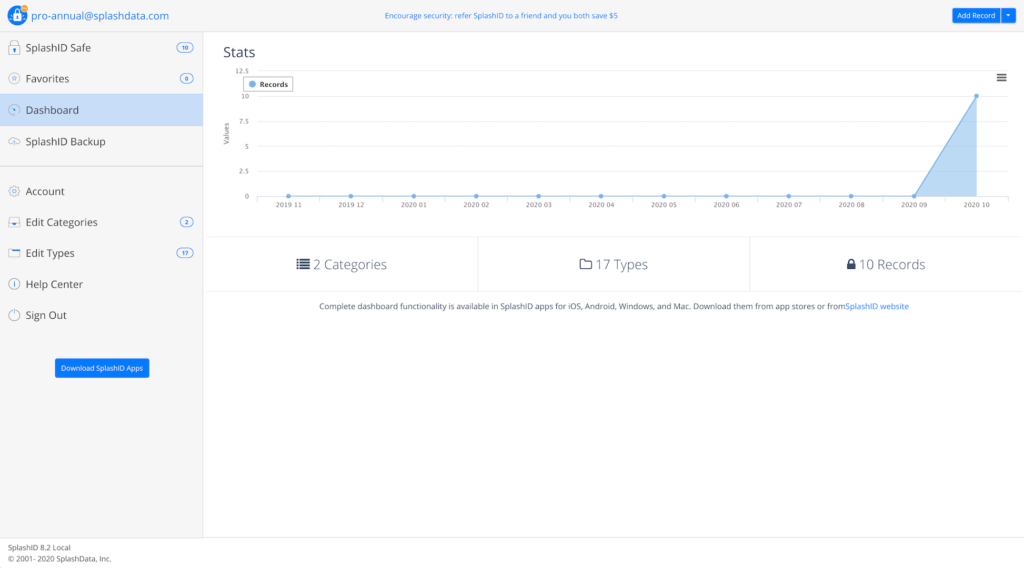 The graph shows you the overall growth of your SplashID database over time, and under that you will find a table indicating the total number of categories, types, and records in your database.