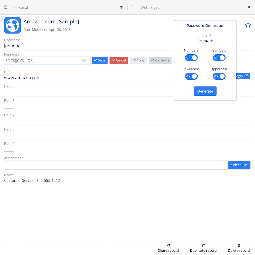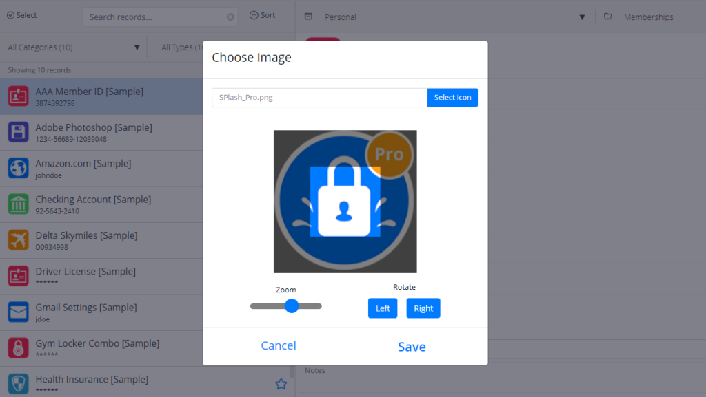 Click the Icon to access the icon picker and make a new selection. This may not be necessary, however, as many logos are automatically assigned after you enter the record name. For example, type "Amazon" for the record name and the Amazon logo shows up when go to the next field or save.