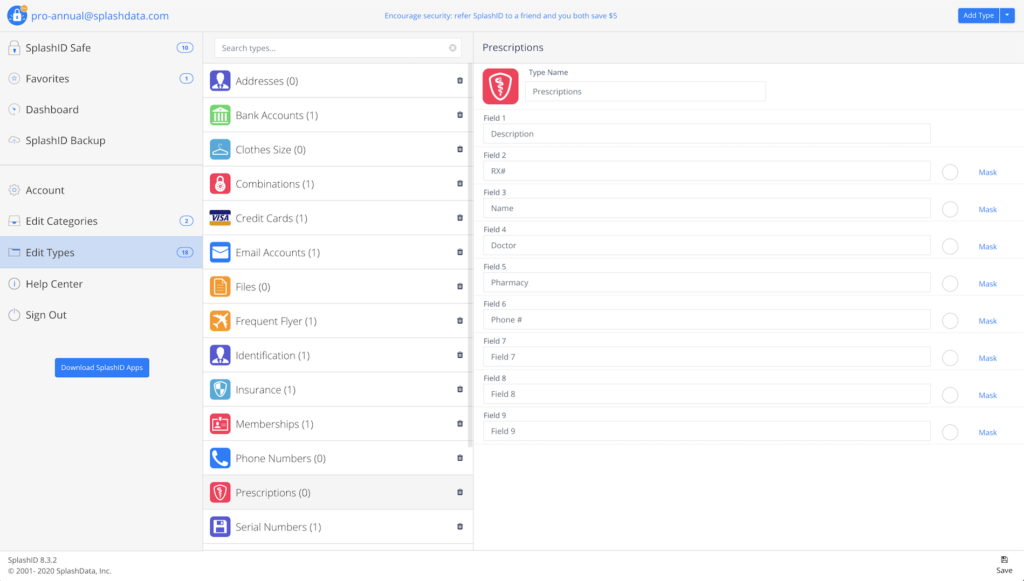 Types act as templates and record identifiers. They define the structure for the items you want to store in SplashID. You may define up to 9 custom field labels and a default icon for each type, as well as specify the fields you wish to mask.