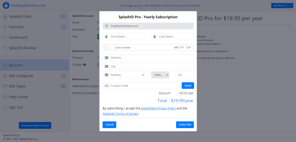 If you do not have a subscription, then you will be presented with options to purchase one. On completing the purchase, you will have access to all the features of SplashID without any restriction on where you can install and use it.