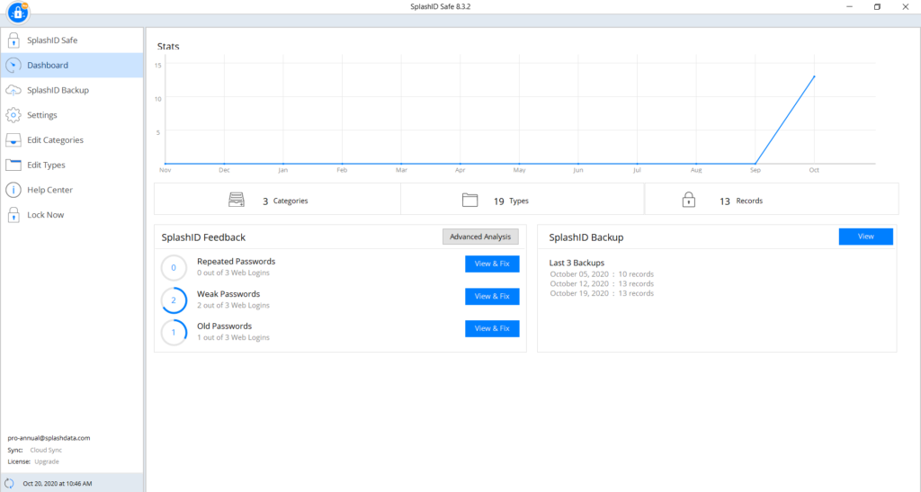 That's where our new dashboard comes in, constantly analyzing your SplashID records to identify old, weak, and reused passwords and enabling you to fix them with just a few clicks!