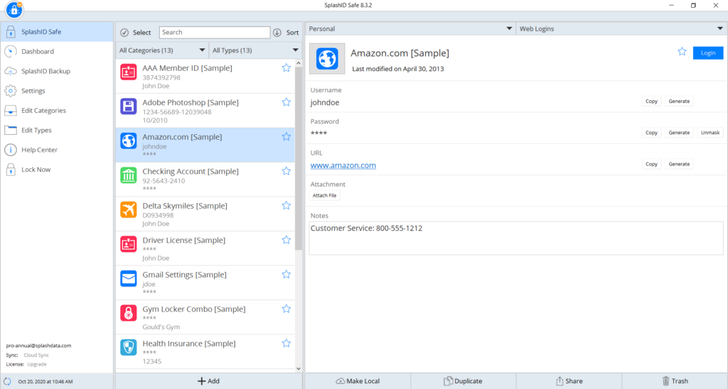 SplashID provides quick and easy access to all of your personal identification information, including usernames, passwords, credit cards, PINs, calling card numbers, frequent flyer numbers, insurance info, and more. Data is stored in a secure, encrypted, password protected format and can be synchronized between SplashID on your mobile device and SplashID on the desktop (Windows, macOS, and web). You may prefer to do most of your data entry on the desktop, however, since it's faster and easier with a keyboard, and then synchronize that data to your other SplashID apps.