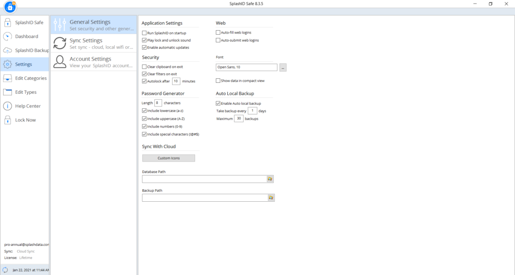 If enabled, a VID backup file of your database will be exported in your SplashID data folder when the application is closed. The settings in this section allow you to set how often the local auto backup happens. The exported VID file created during the auto backup can be imported in case of a catastrophic loss of data. Your SplashID master password protects the backup files and will need to be provided when you import your records from these files. More details are available in the Backup & Restore section below.