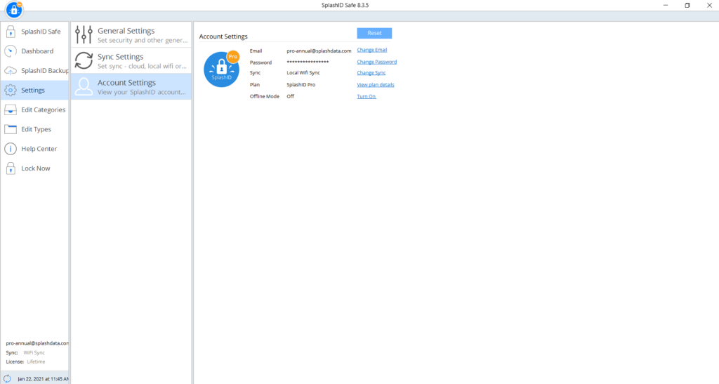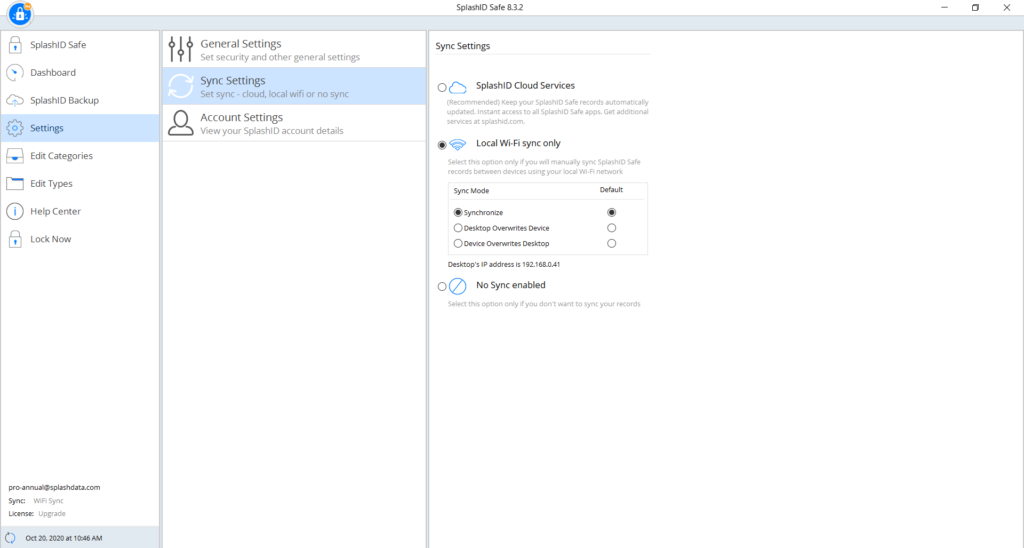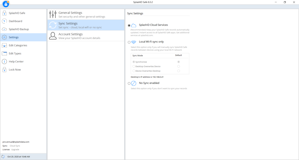 This is where you select your sync settings for SplashID Desktop. Since SplashID 8, a SplashID Pro license is required for either of the three sync methods, Cloud or WiFi or No. You can choose and change at any time if you have a SplashID Pro license.