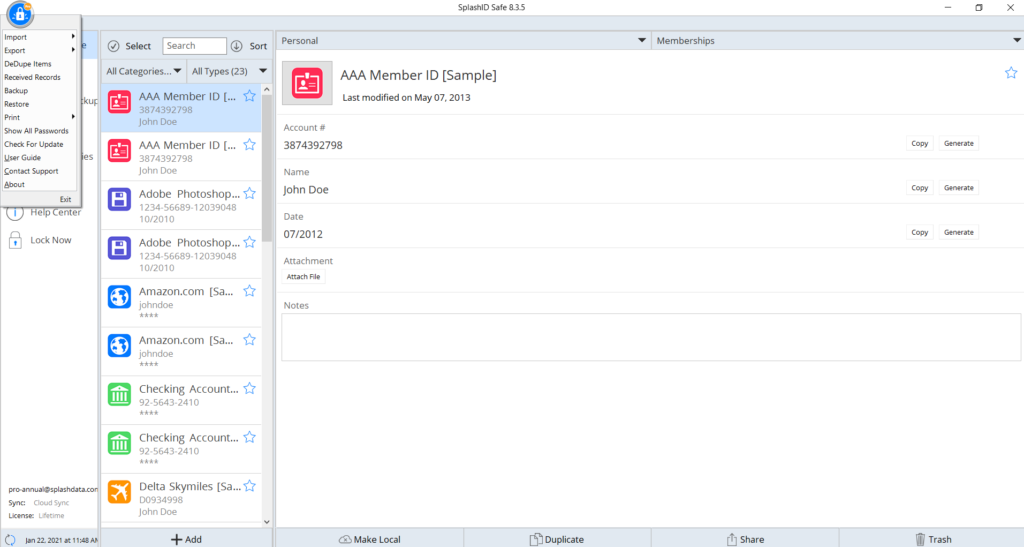 Items may be created or edited on the mobile device or Desktop and the changes can be synchronized over your local WiFi network. You can download SplashID Desktop for Mac or Windows from https://www.splashid.com/downloads.