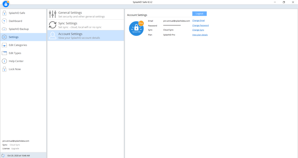 - Change Email - Click to change the email address associated with your SplashID account. After, a change you will need to verify the email address by clicking on a link in the verification email sent to the new address.