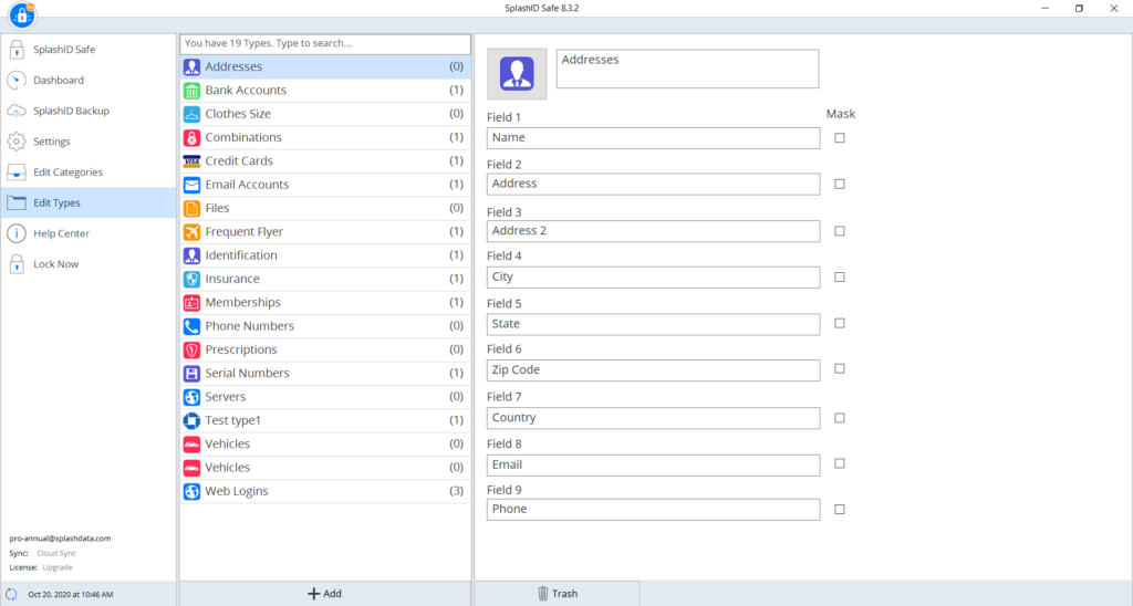 Types act as templates, which define the structure for the items you want to store in SplashID. You may define up to nine Custom field labels and a default icon for each type, as well as specify the fields you wish to mask or unmask.