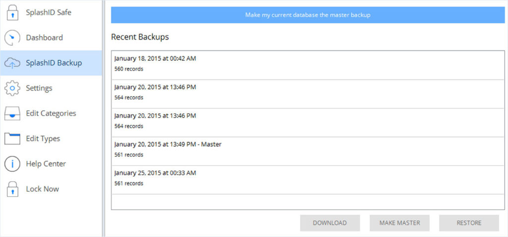With SplashID 8, cloud sync users have a new backup service that protects them from data loss forever. Every week, a new encrypted backup is automatically created for you. Your 5 most recent backups are available anytime to download or restore as your current database. And you can lock in any backup (or your current database) as your master backup.